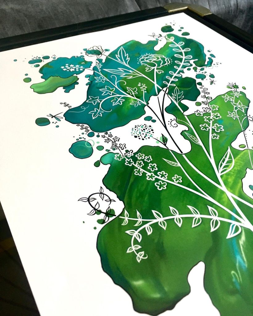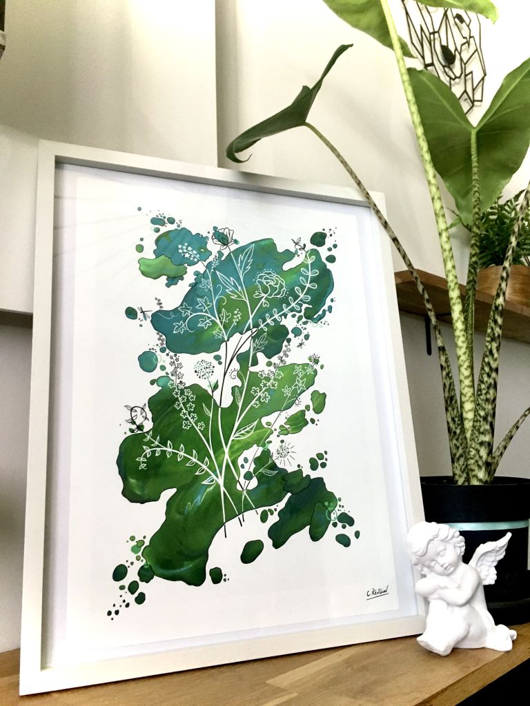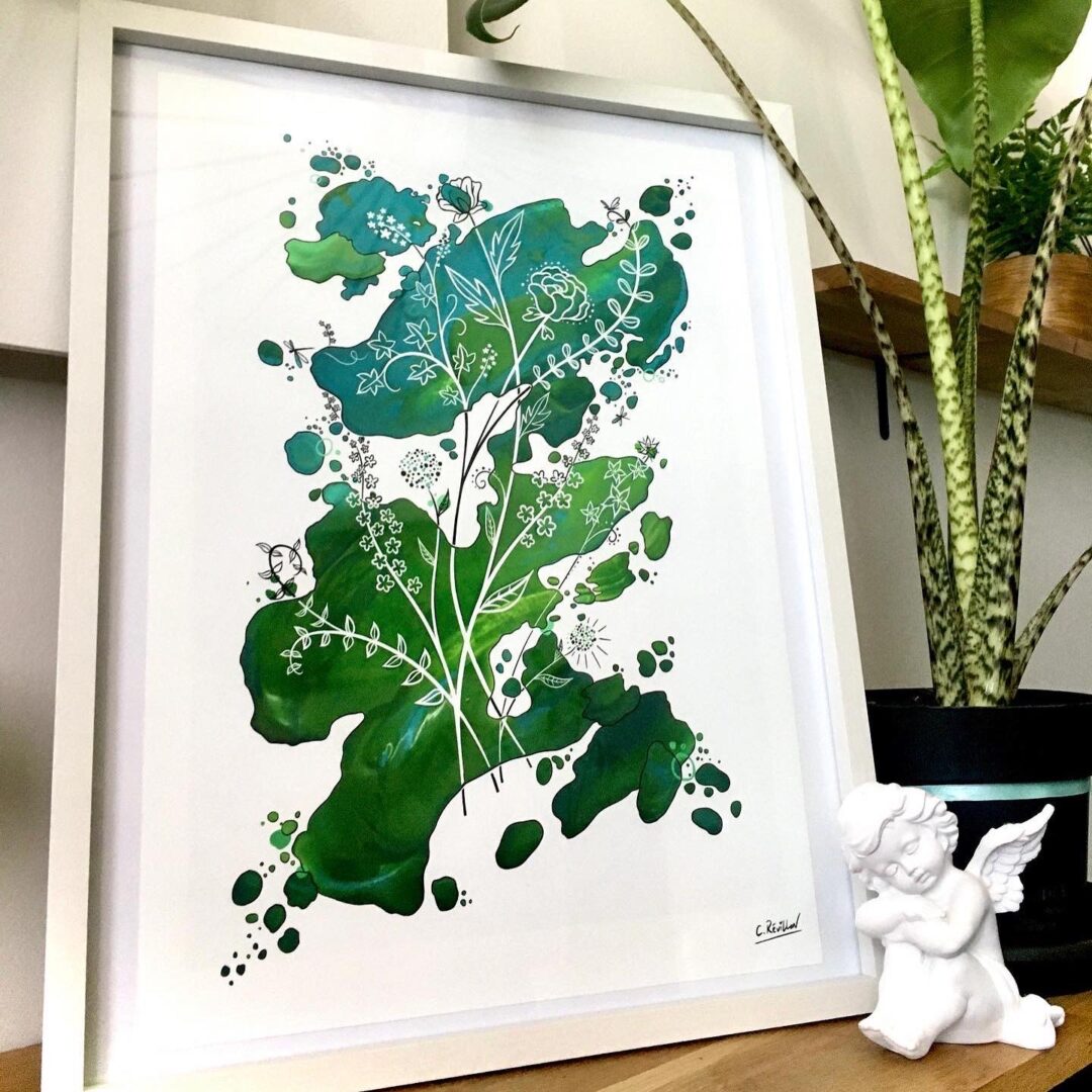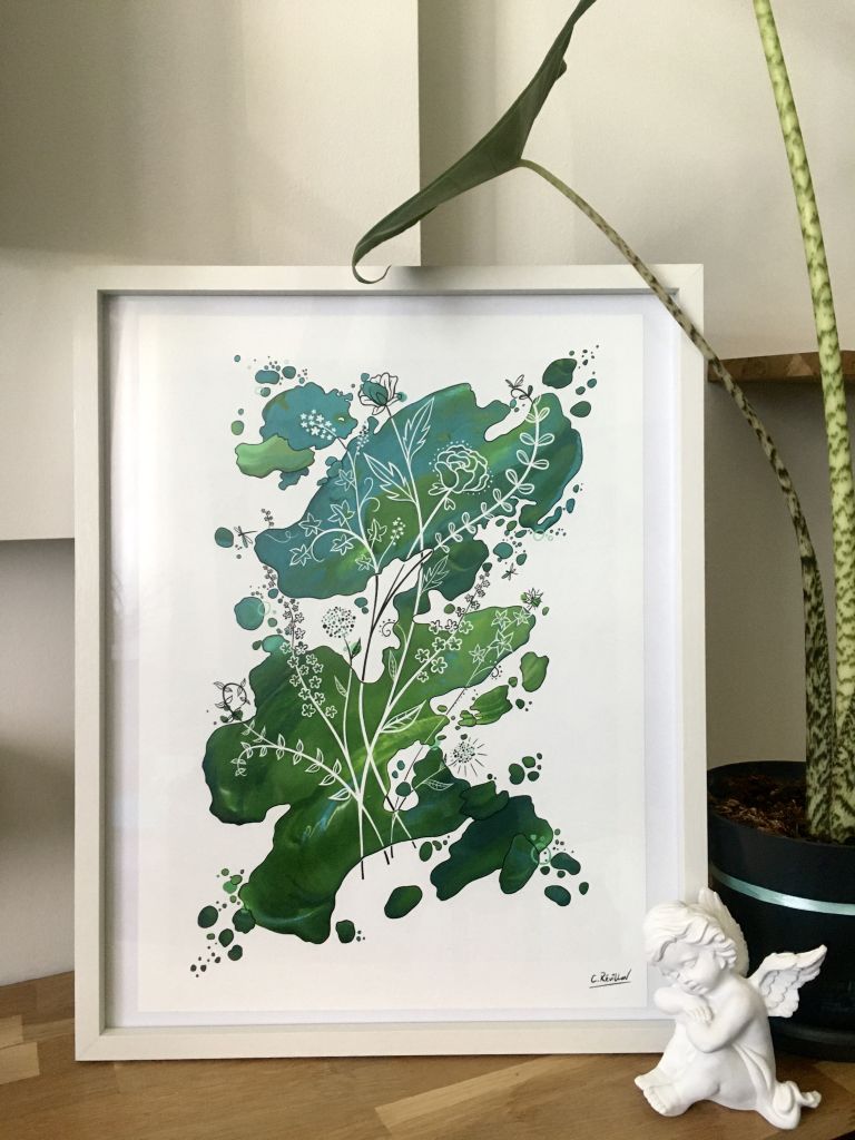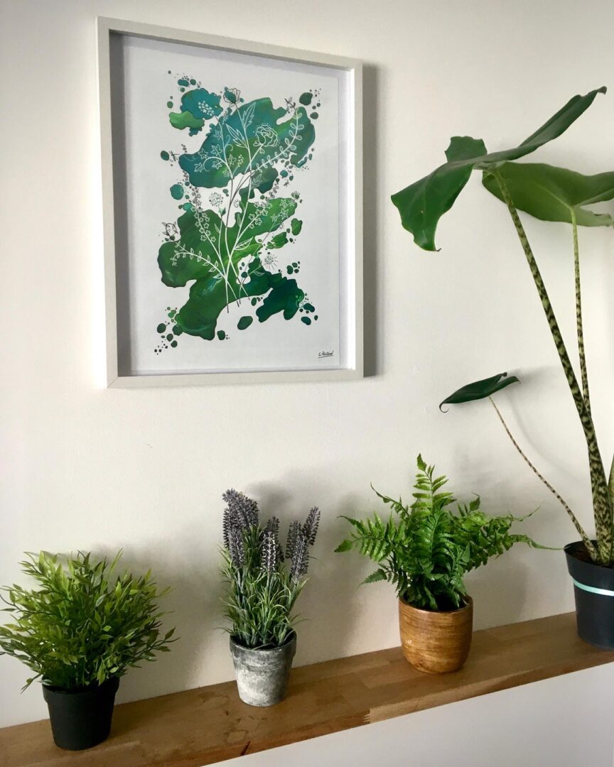 Une affiche décorative végétale et rafraîchissante, résultant de la rencontre entre peinture acrylique pour le fond et la couleur, et dessin numérique pour les détails et la finesse !