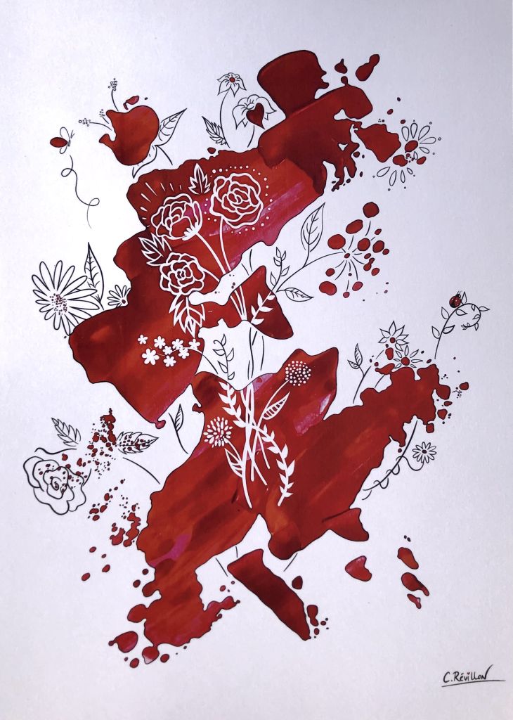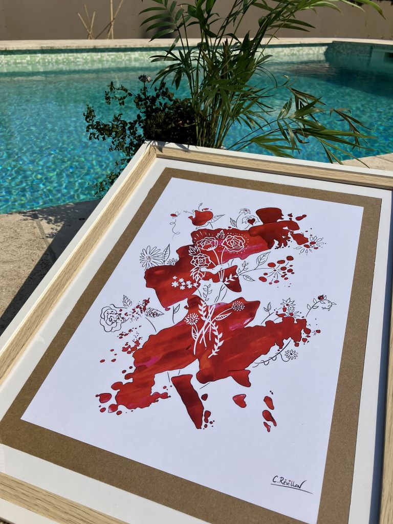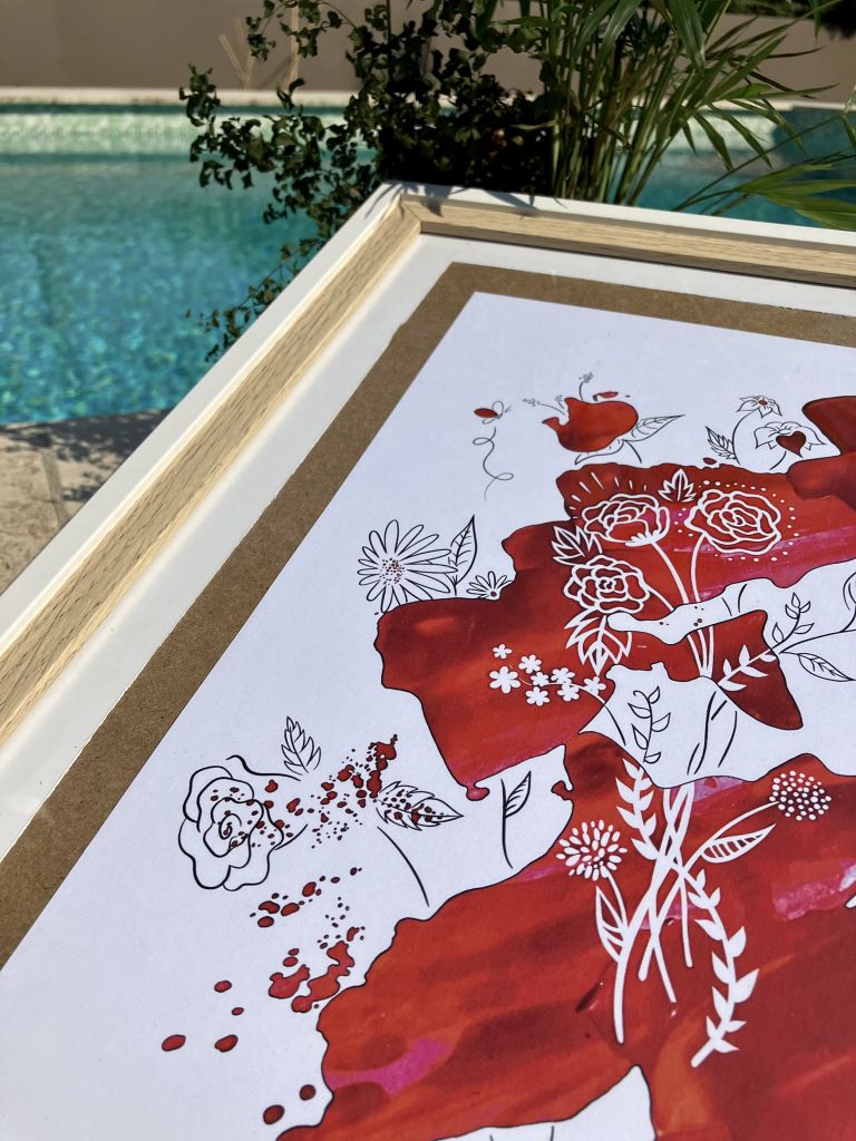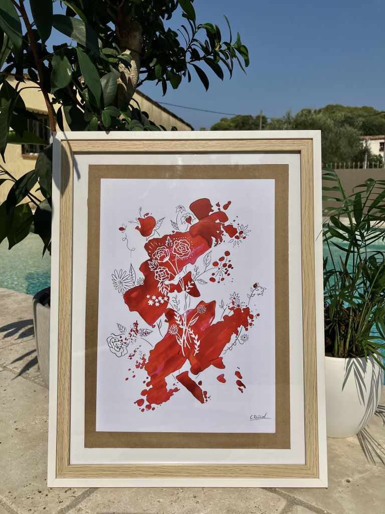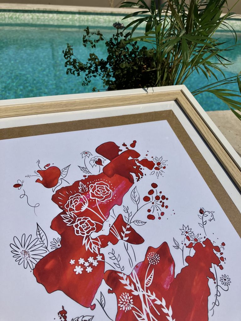 Une belle affiche aux teintes estivales, mettant à l’honneur les roses et leur grâce, résultant de la rencontre entre peinture acrylique pour le fond et la couleur, et dessin numérique pour les détails et la finesse !