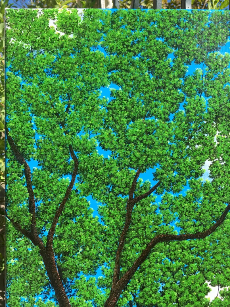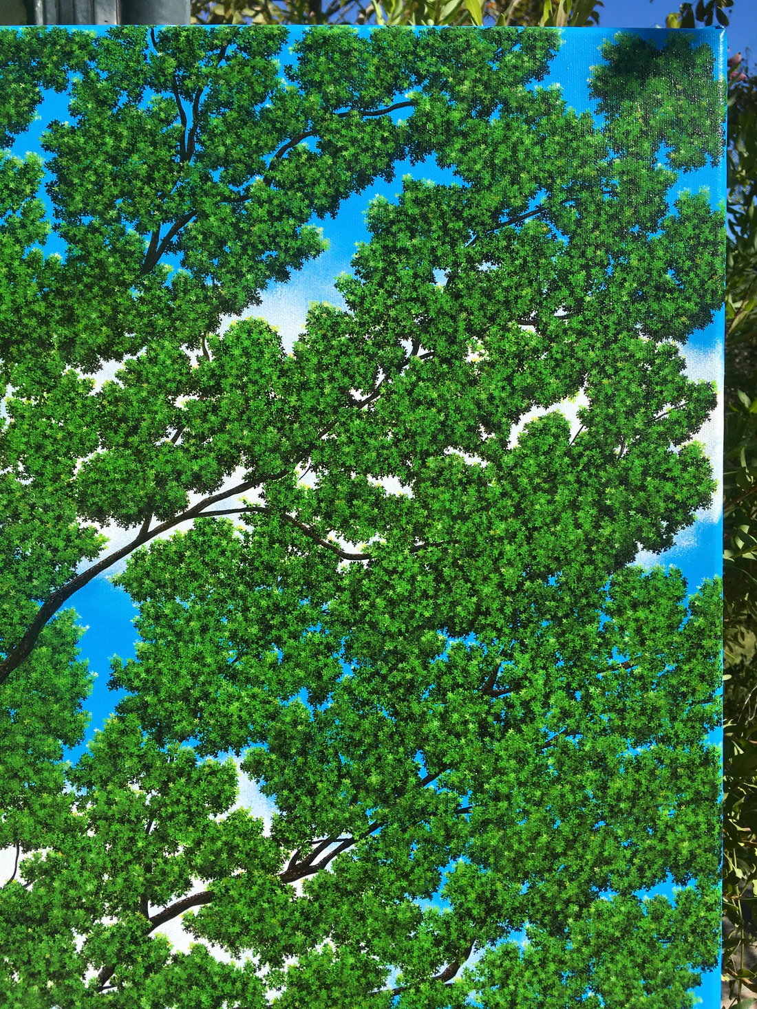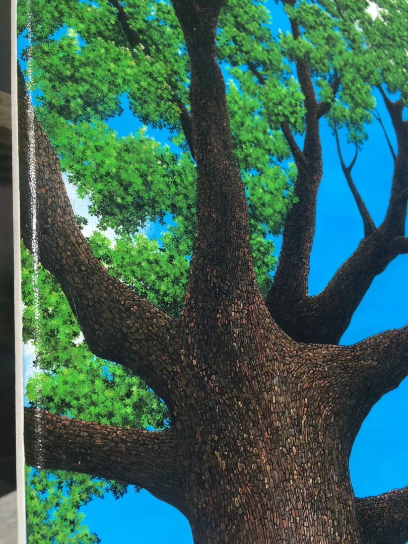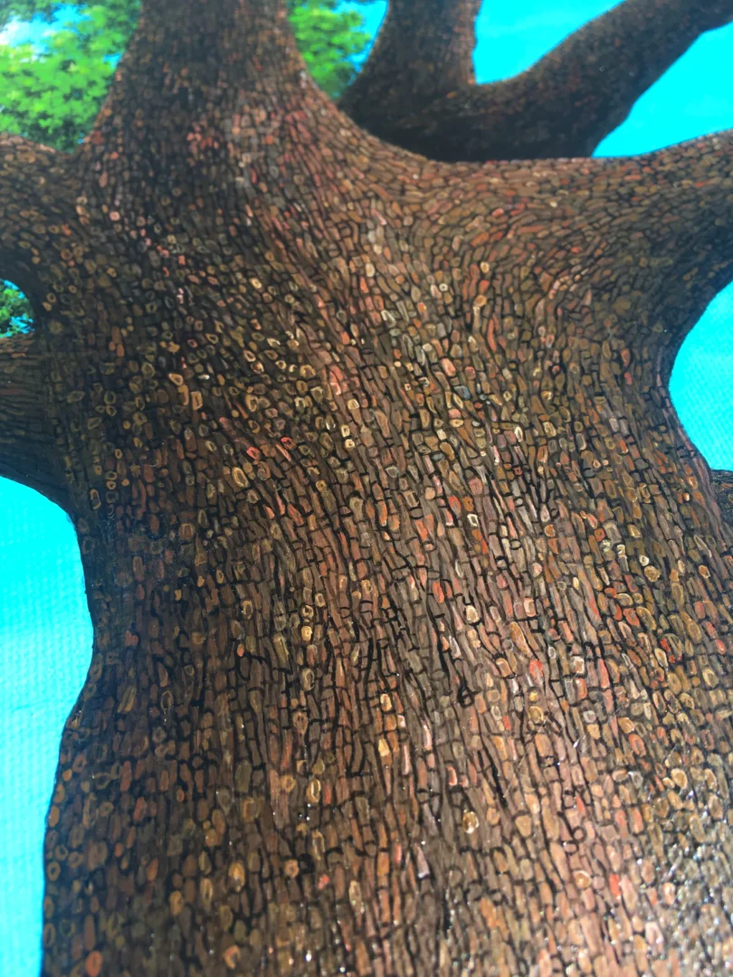 Azur est un hommage au ciel de la Côte, et aux chênes que l’on peut y rencontrer. Le travail des détails de l’écorce est ce qui m’a le plus ravie, et qui m’a réellement mis dans un état second lors de la réalisation. On pourrait penser que le sujet central est le feuillage du chêne, ou encore le bleu du ciel au vu du nom du tableau, mais il n’en est rien.