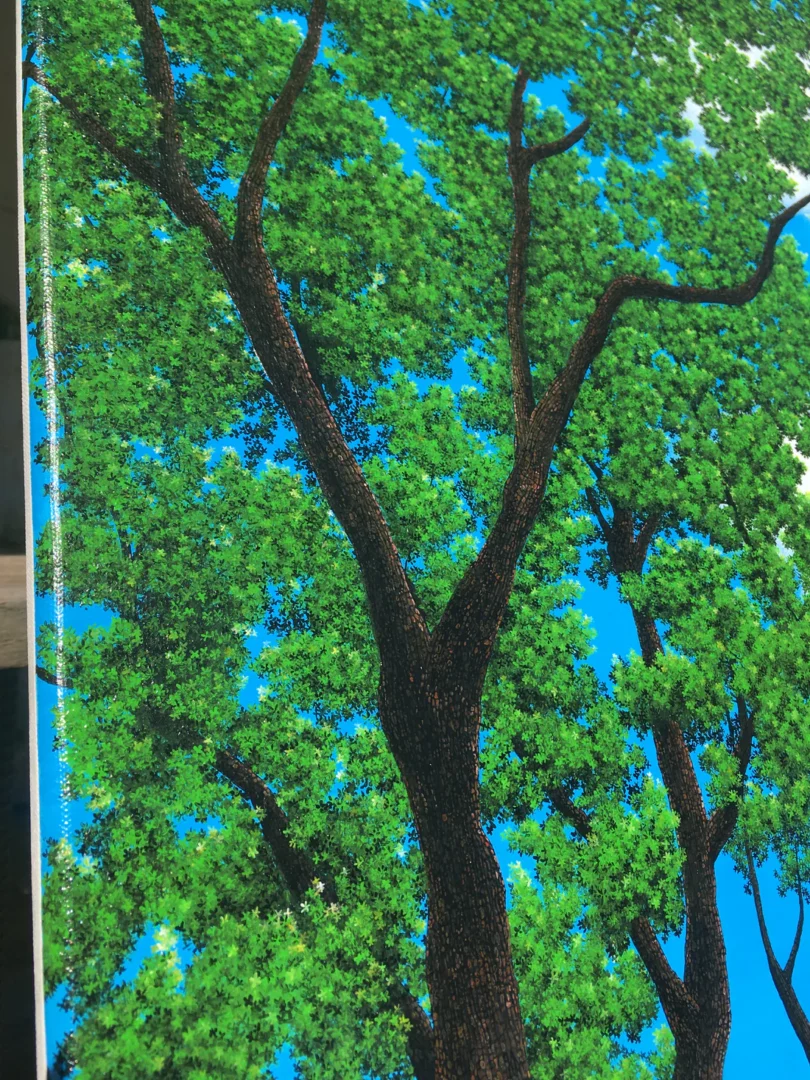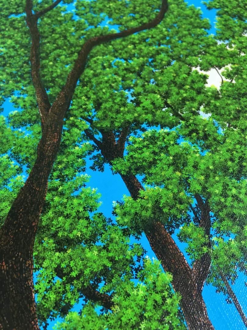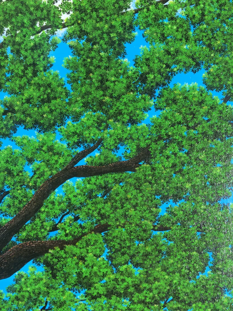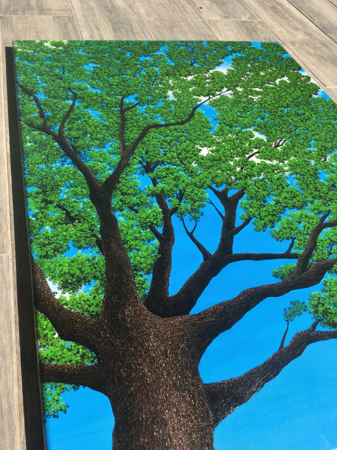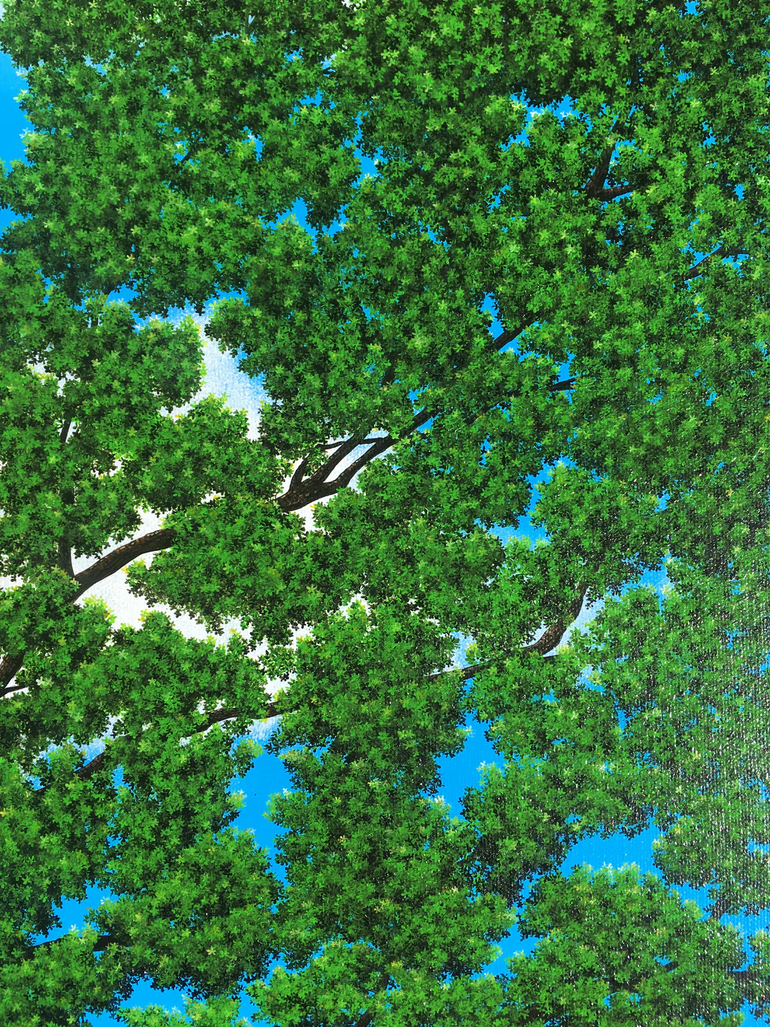 Azur est un hommage au ciel de la Côte, et aux chênes que l’on peut y rencontrer. Le travail des détails de l’écorce est ce qui m’a le plus ravie, et qui m’a réellement mis dans un état second lors de la réalisation. On pourrait penser que le sujet central est le feuillage du chêne, ou encore le bleu du ciel au vu du nom du tableau, mais il n’en est rien.