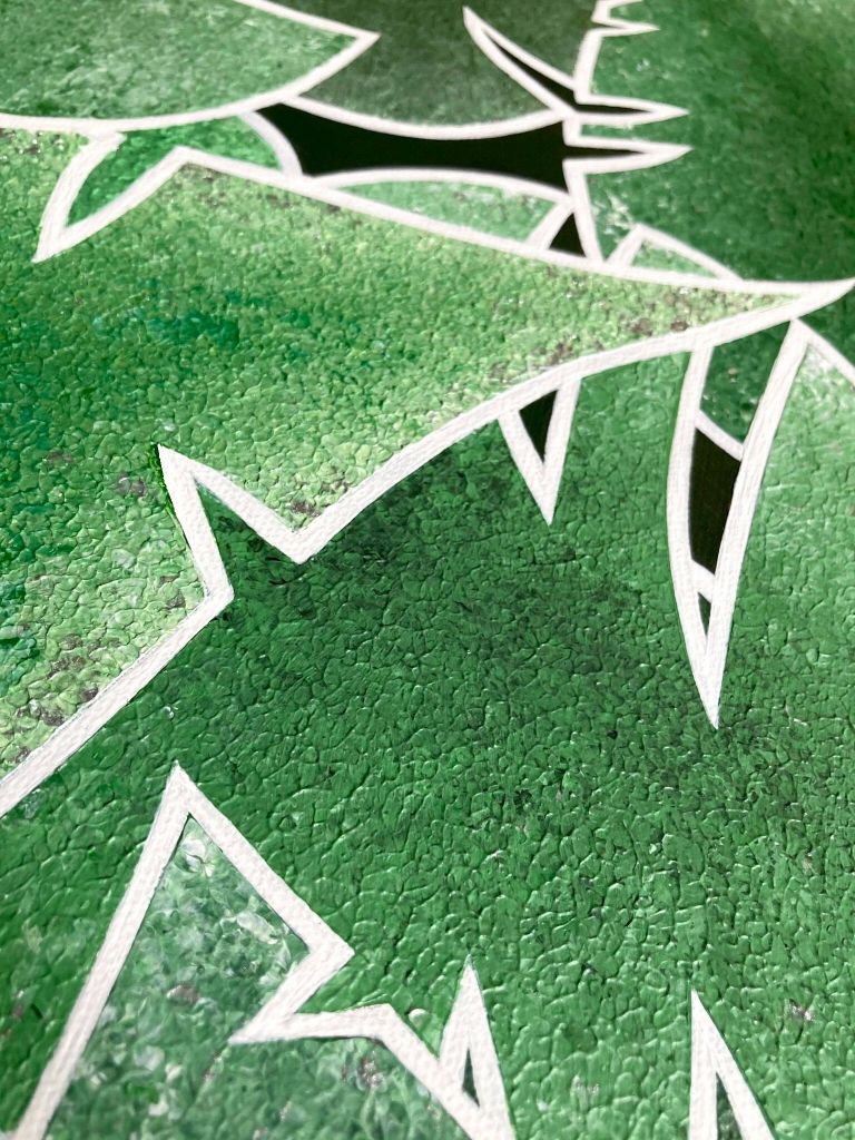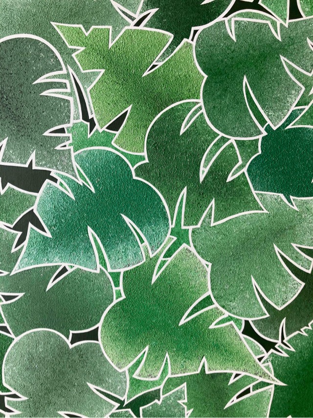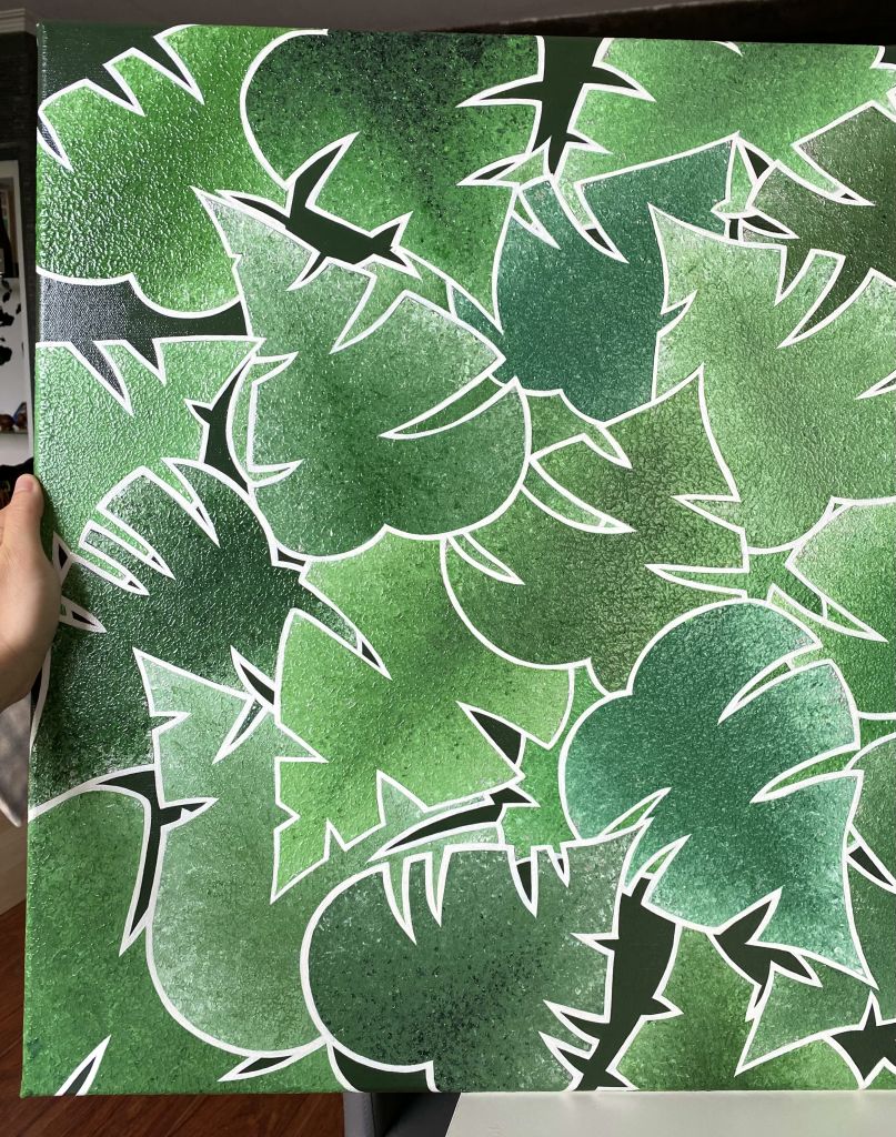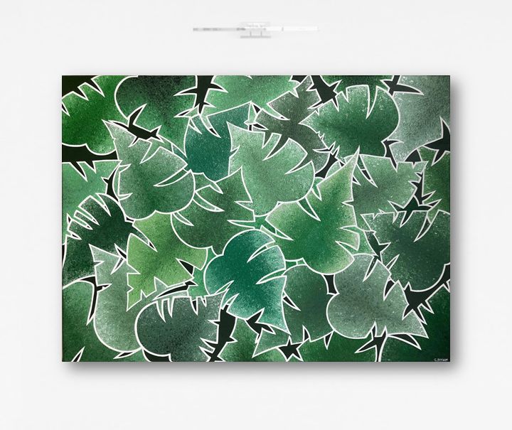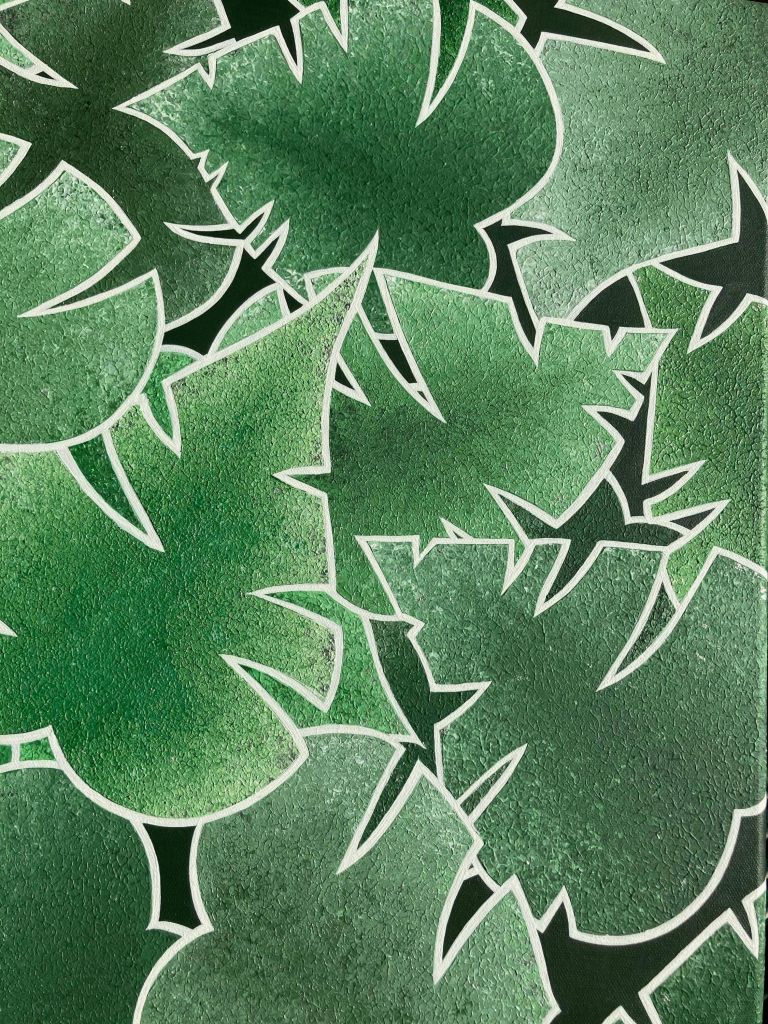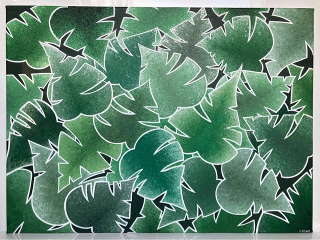 Come Into Leaf est une œuvre issue d’une commande (la toute première que j’ai réalisée d’ailleurs !). Elle représente une superposition de feuilles type « Monstera », dans un camaïeu de vert, dont la texture est imitée par les nervures que permet le travail de l’acrylique au couteau.