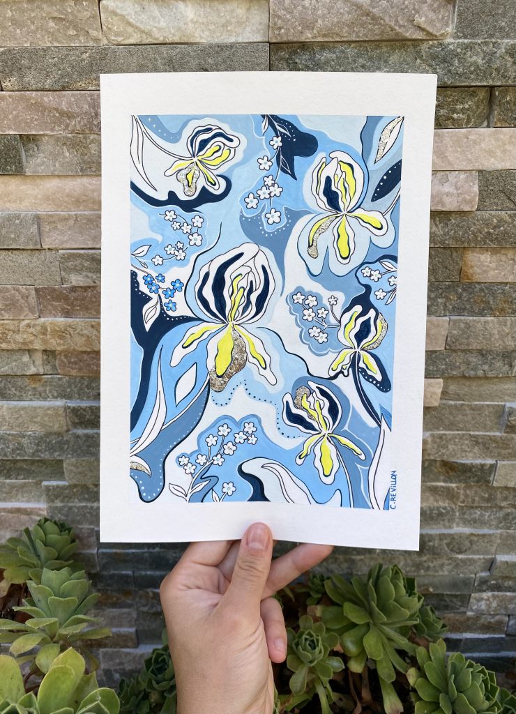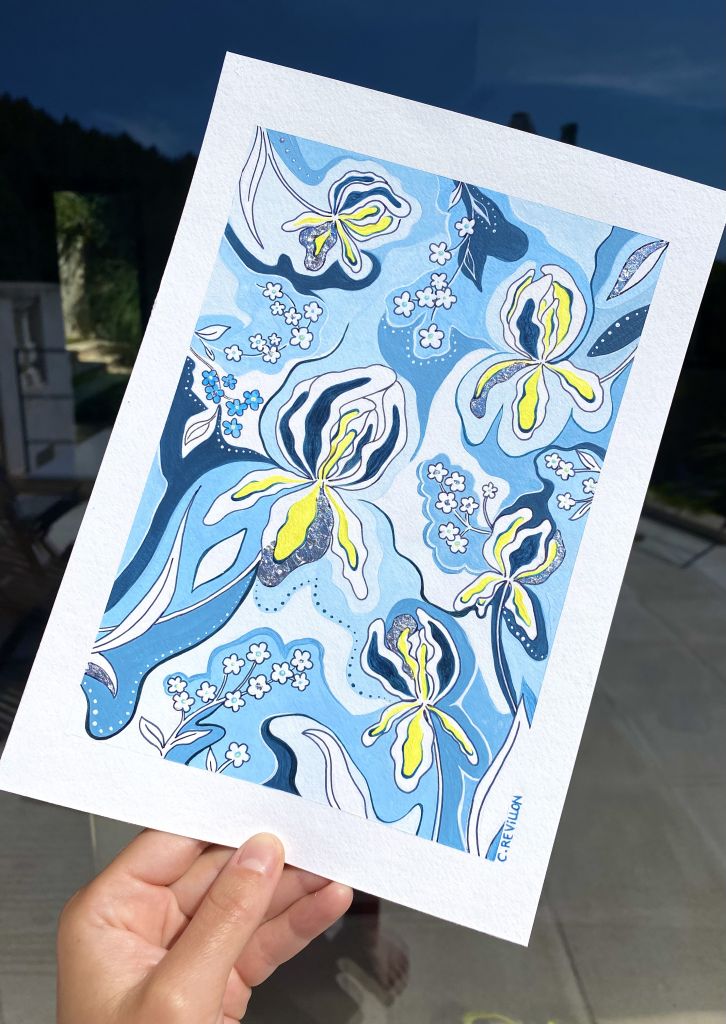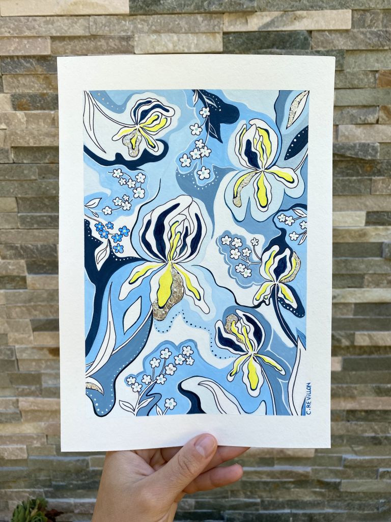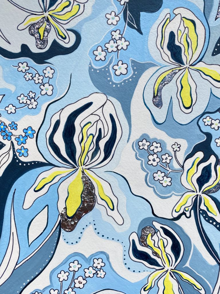 Une jolie pièce unique célébrant les Iris d’Allemagne et les myosotis, sur fond bleu ciel 🌼