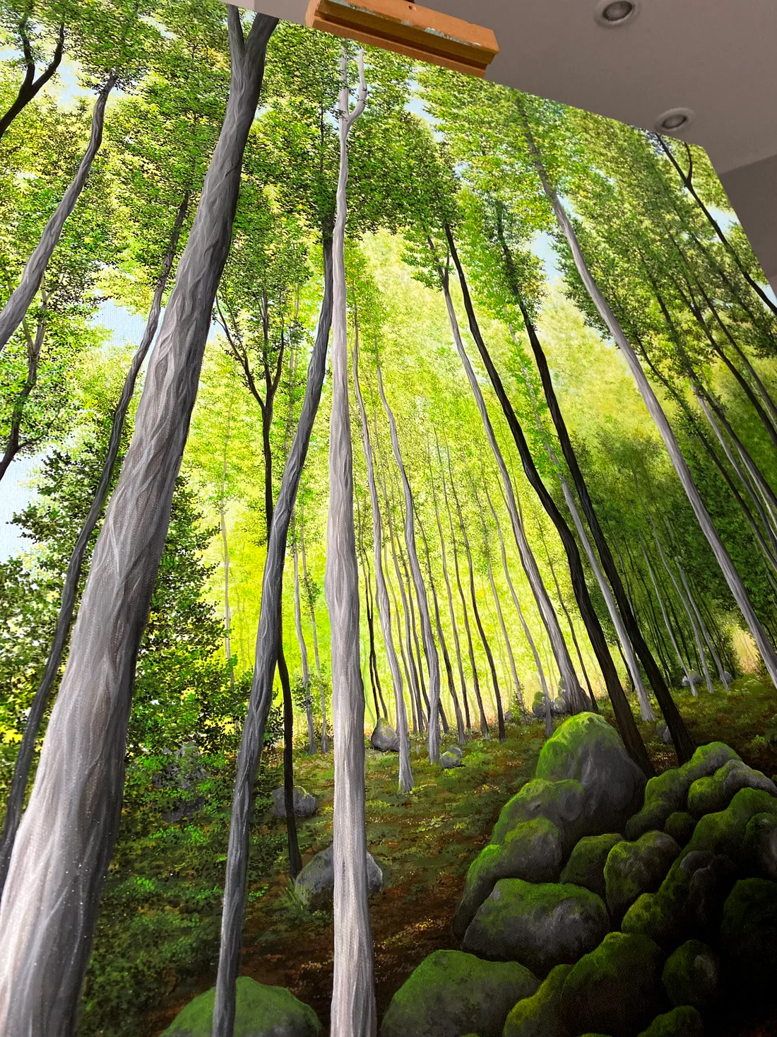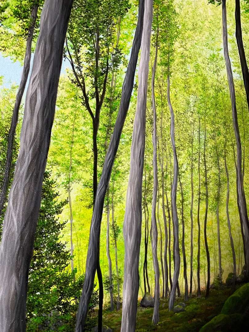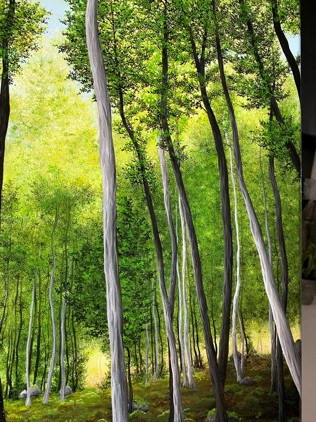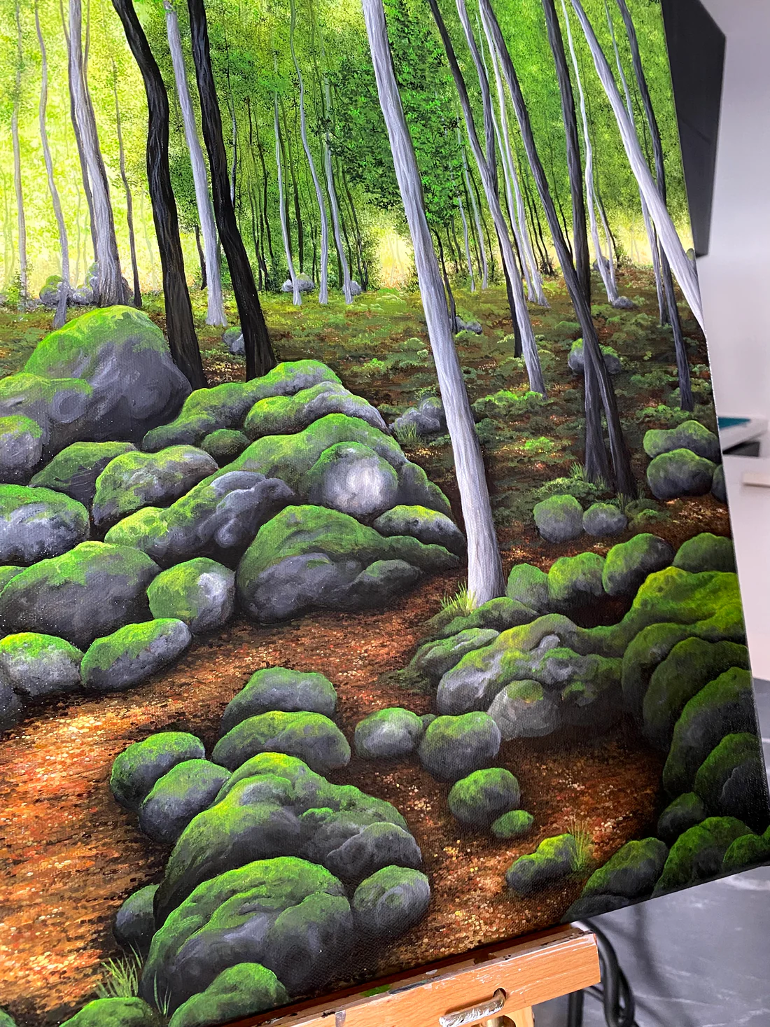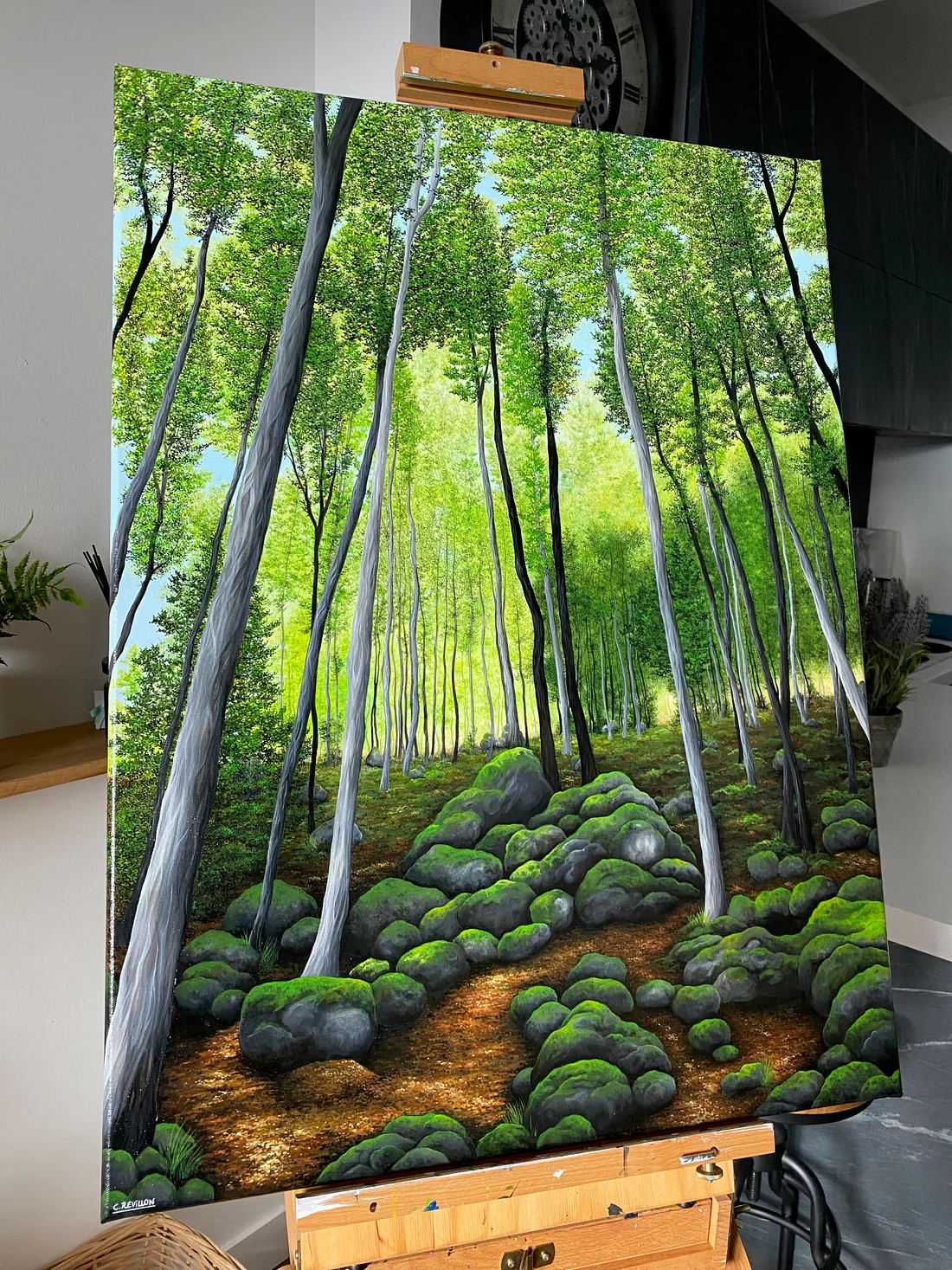 J’en suis tombée amoureuse, et j’en ai fait ma muse dès mon retour à l’atelier. Il est le résultat de plusieurs mois de peinture, certes, mais surtout de recentrage, de méditations, de visites de souvenirs, afin de retranscrire parfaitement l’ambiance si particulière qui émanait de ce lieu féérique, et qui m’a tellement marquée.