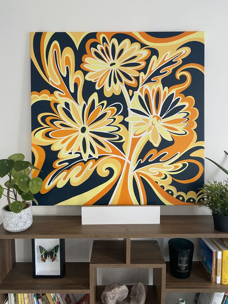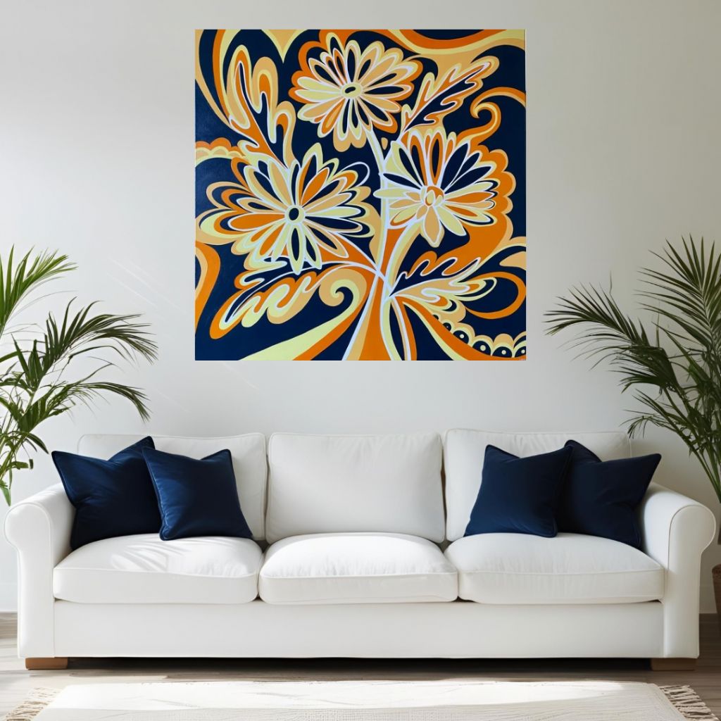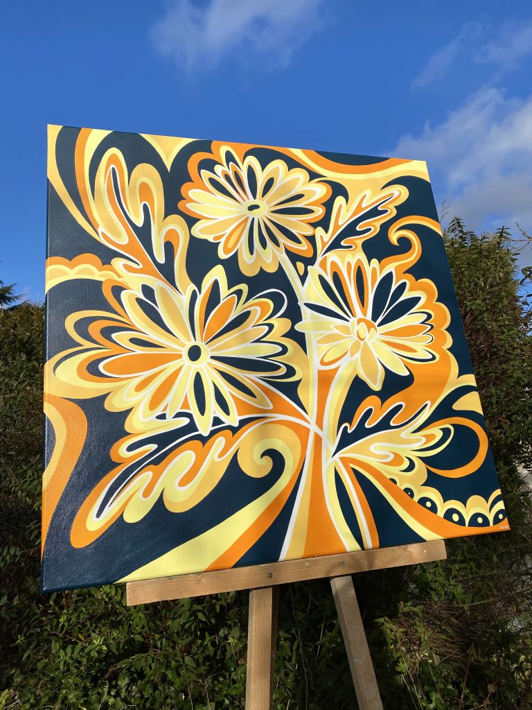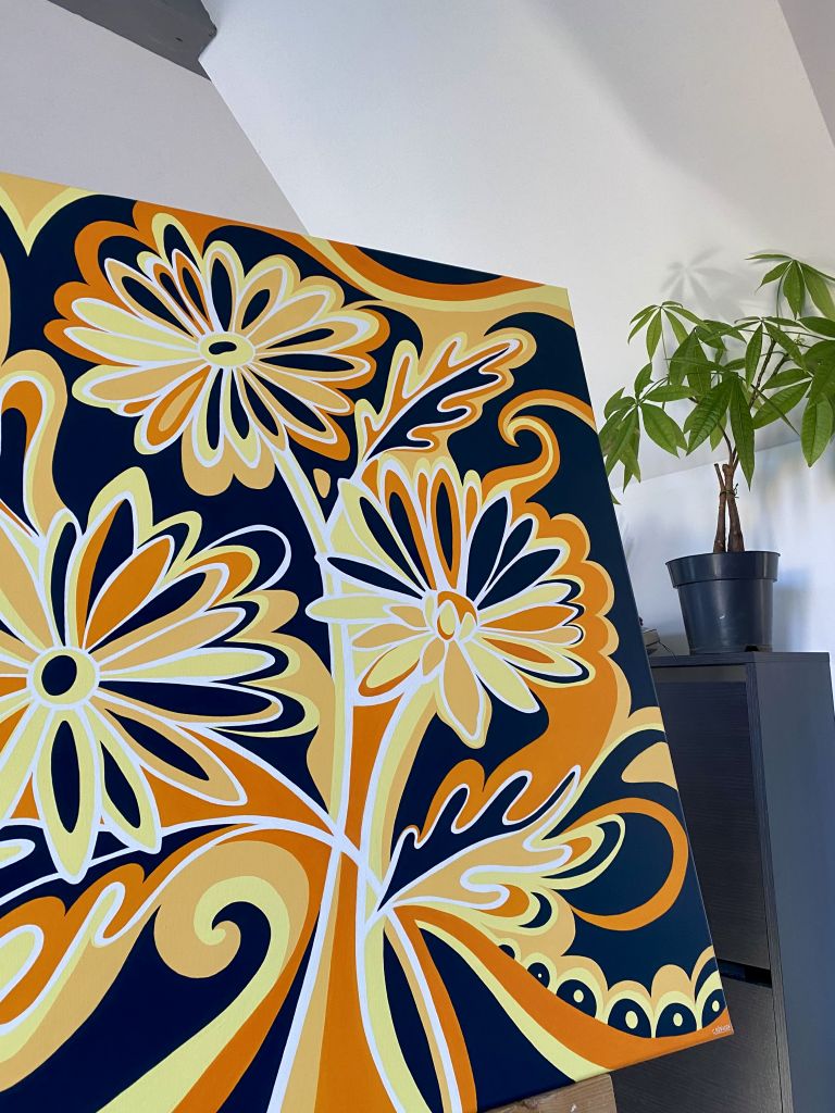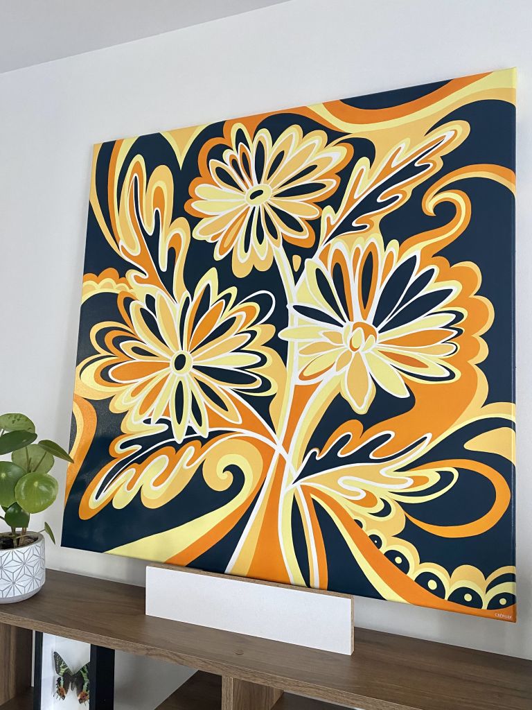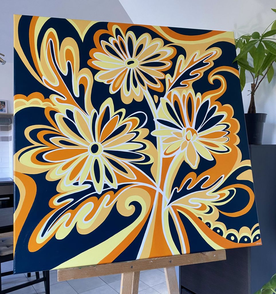 Les Marguerites s’entremêlent sur cette toile riche en contraste, alliant le bleu canard avec des nuances chaudes d’orange et de jaune. Une œuvre tout en courbes, dynamique et colorée.