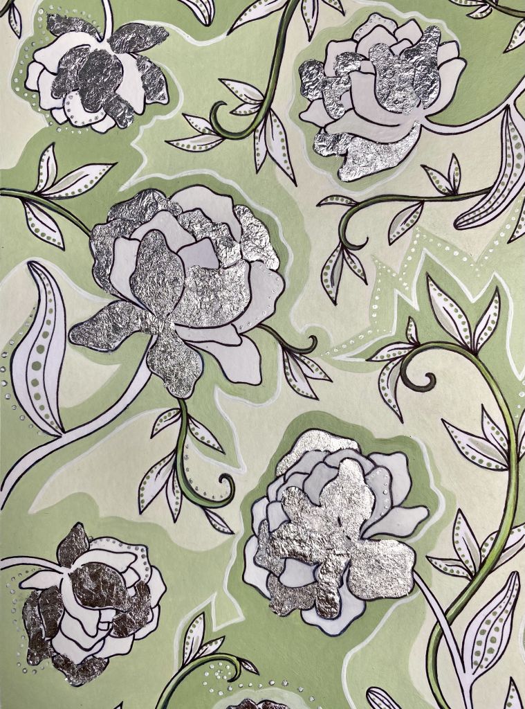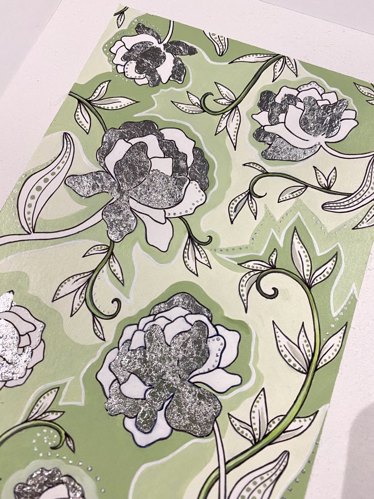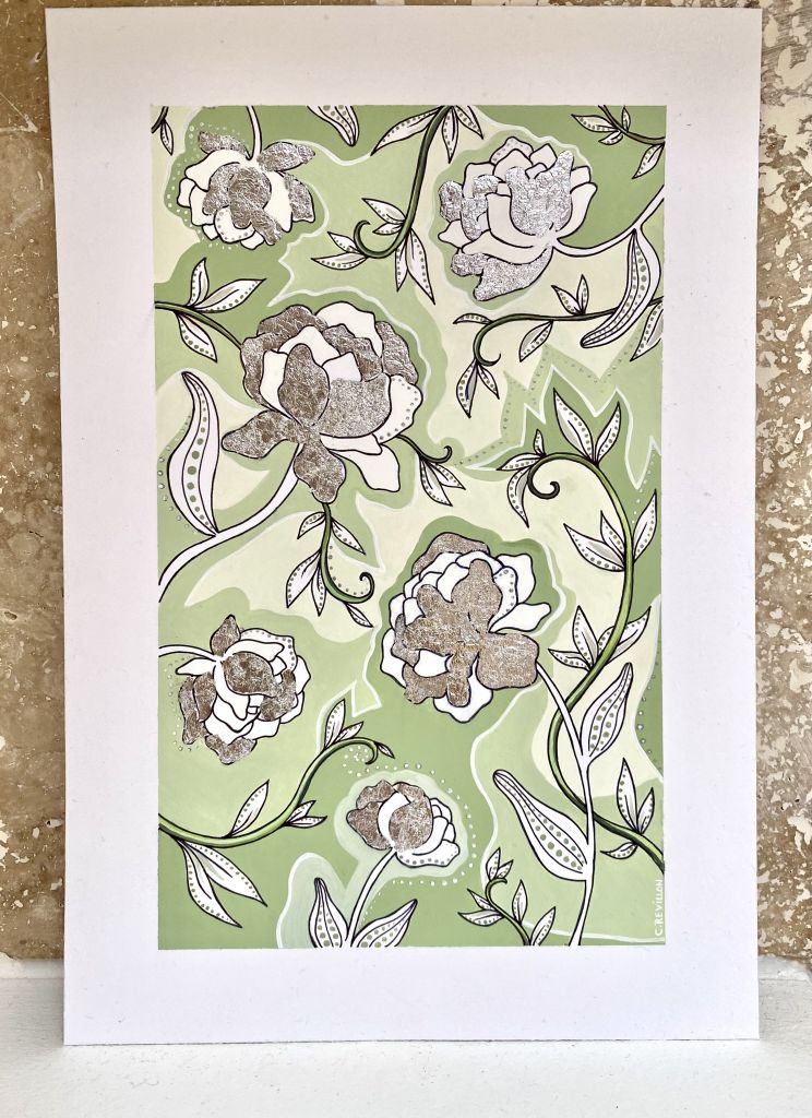 Une jolie pièce unique célébrant de gracieuses pivoines, habillées de feuilles d’argent ✨