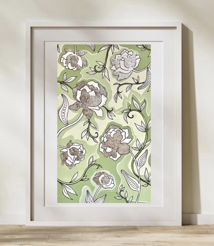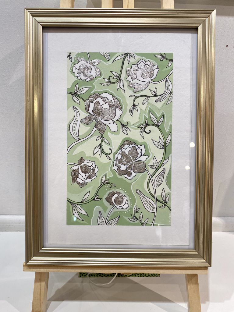 Technique et prix : Peinture acrylique et feuilles argentées sur support papier 360g, format total avec encadré blanc de 27,5cm x 18,5cm. Signée et datée au dos (réalisée en 2023) – 100€ seule / 120€ vendue avec son cadre doré.