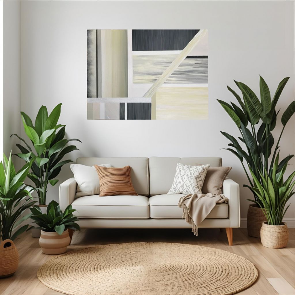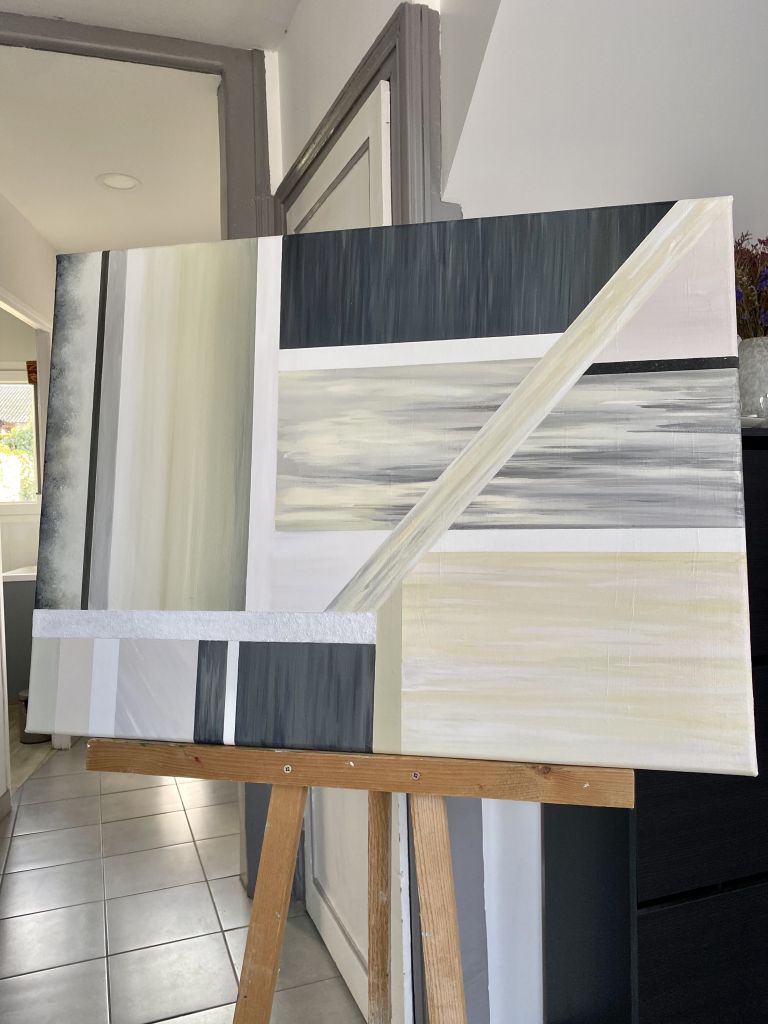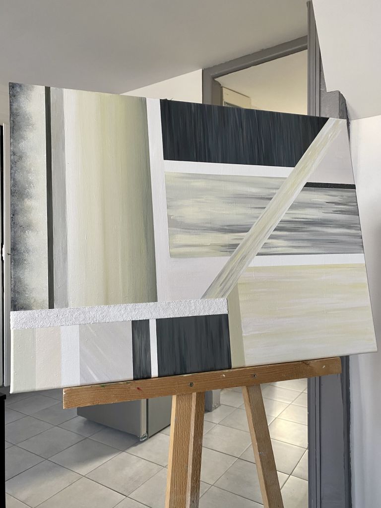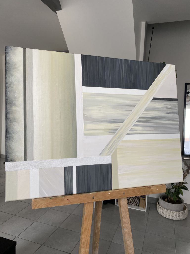 Sable, une œuvre apaisante aux sous tons chauds, avec son jeu de contrastes, de textures et de matériaux divers (acrylique & sables de différentes granulométries). Au second regard, on y découvre des reliefs cachés ; vestiges d’un ancien tableau, dont les coups de pinceaux ont résisté au temps, et aux nouvelles couches de peinture.